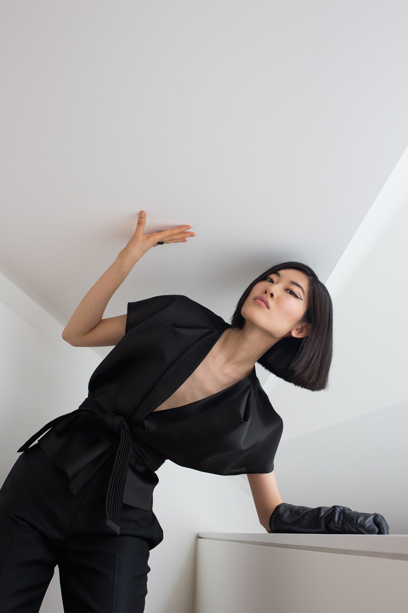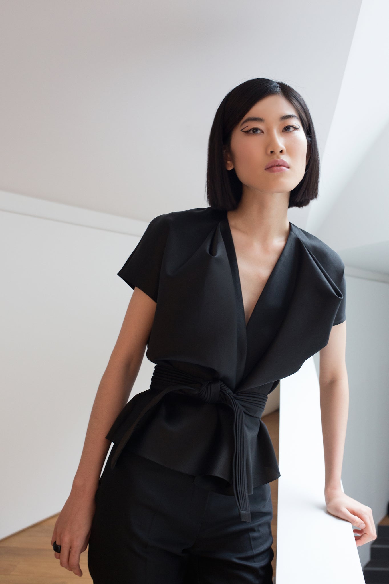 Wrap top with sculptural cone shape details and a separate belt in black silk gazaar.