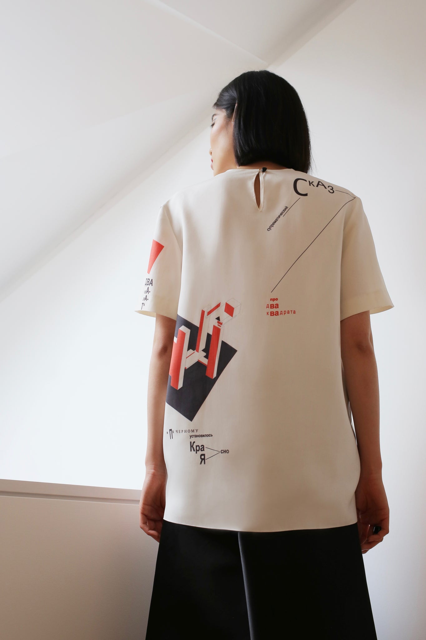 Oversized T-shirt made with printed silk. The print inspiration comes from an illustrated book "The Suprematist Tale of 2 Squares" by a pioneering artist, graphic designer and typographer El Lissitzky.