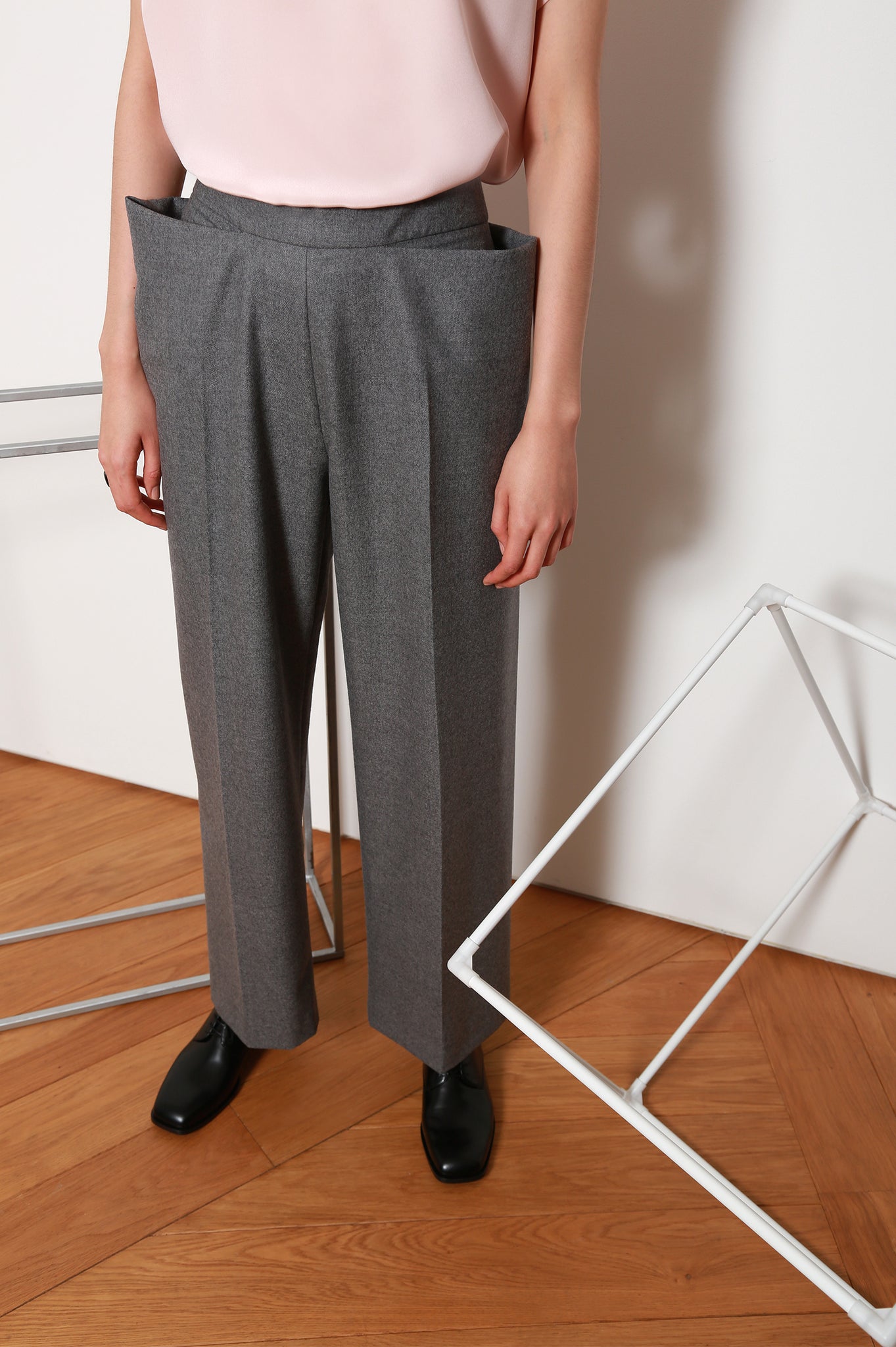 High-waist wide-leg trousers with silhouette-altering square pockets inspired by the futurist theatre designs of Varvara Stepanova. Made with wool / cashmere mix in grey.