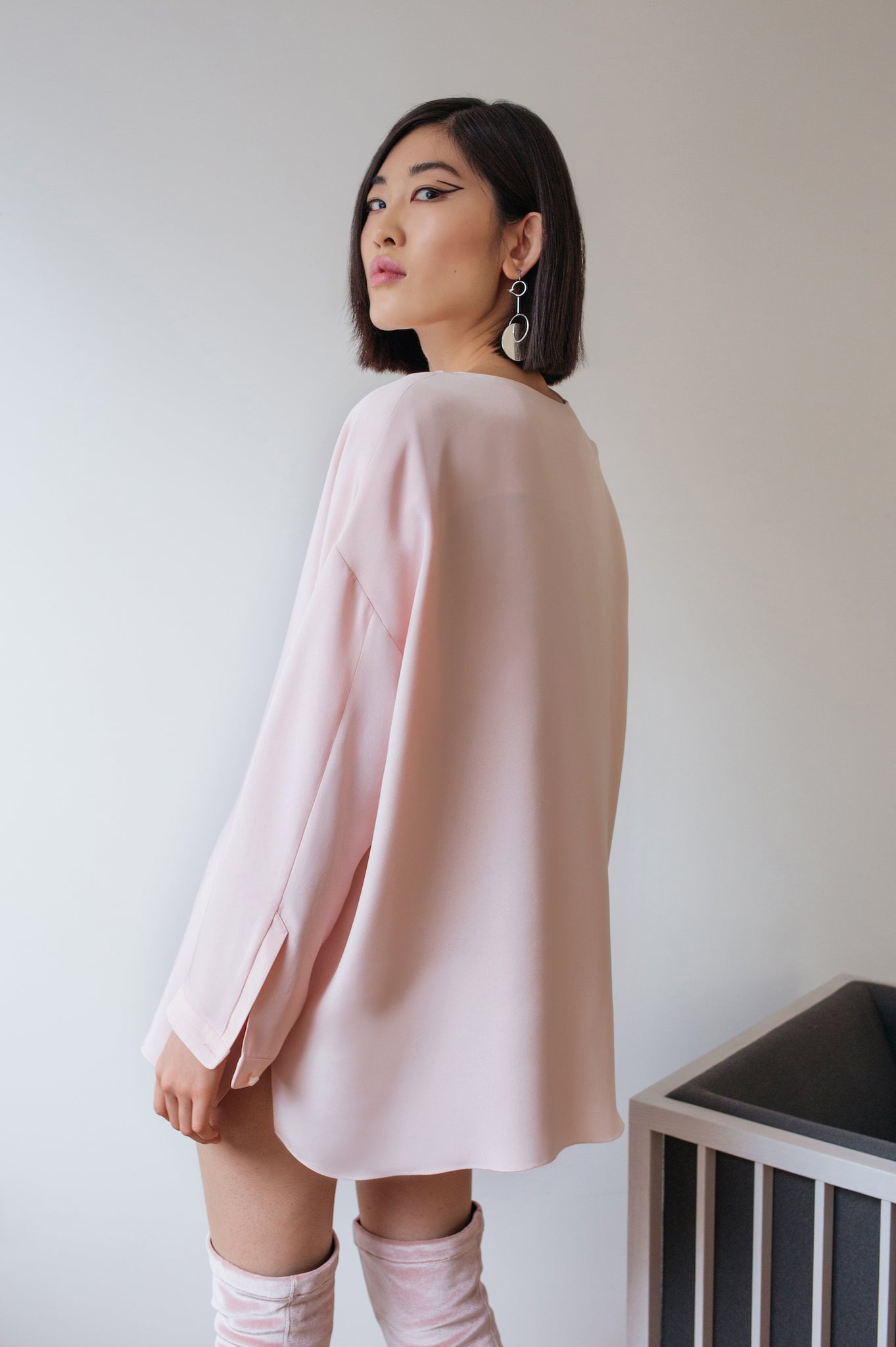 Oversized shirt with long sleeves and a side opening. Made with pale pink silk double crepe. Triangular-shaped glass buttons.